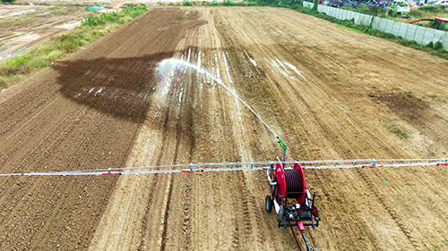 2、該產(chǎn)品是一款自帶動力自走卷盤式噴(淋)灌機,卷盤上盤有PE管,口徑63毫米、長度100米。整機自動行走進地,進行鋪放和回收PE管進行澆水作業(yè),畝澆水量大小通過調(diào)整卷盤整機行走速度。PE管全部回收后,自動停機。